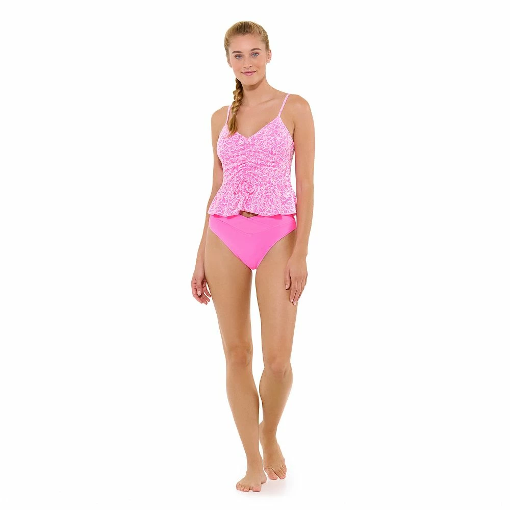 Cinched front details add a charming look to this juniors’ Ninety-Nine ° tankini top.