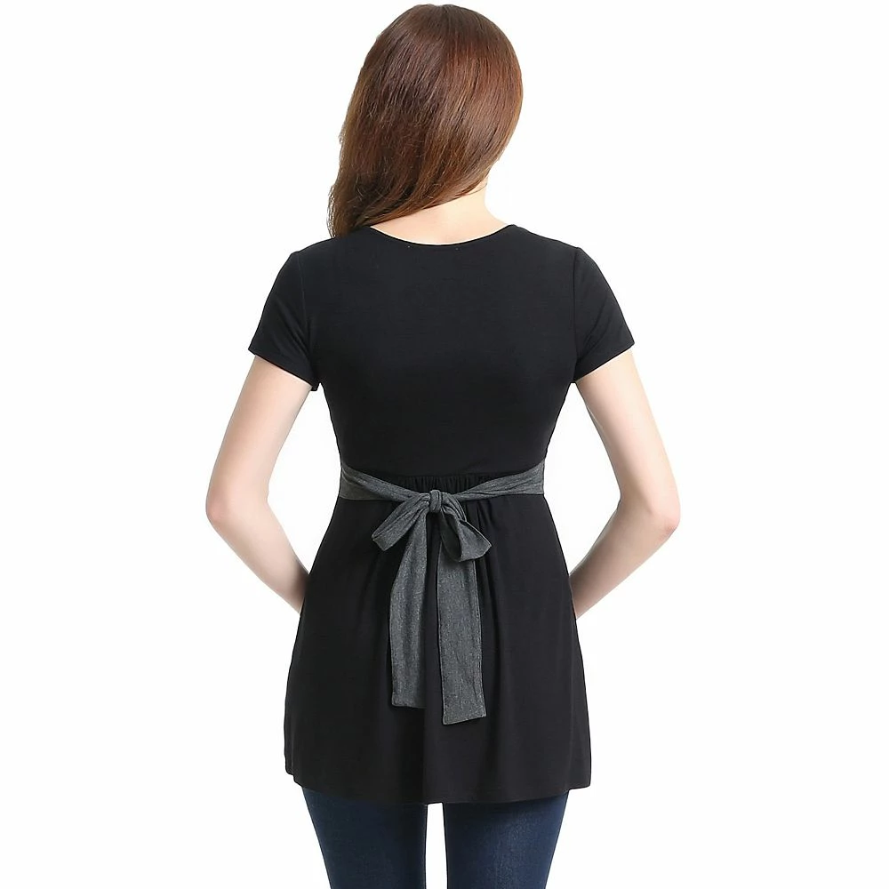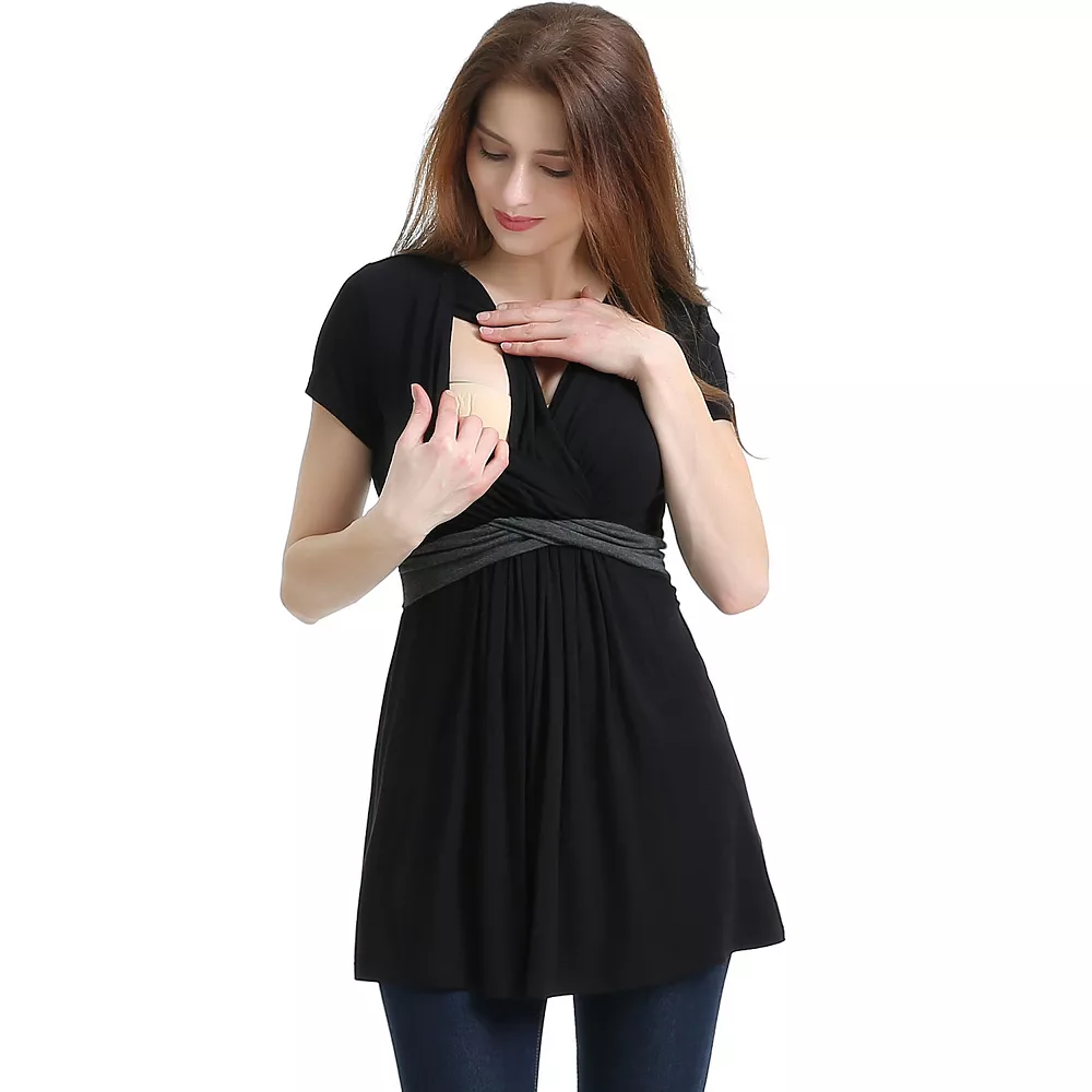 For a cute look throughout your pregnancy, to nursing and beyond, reach for this maternity faux-wrap top by Pokkori.