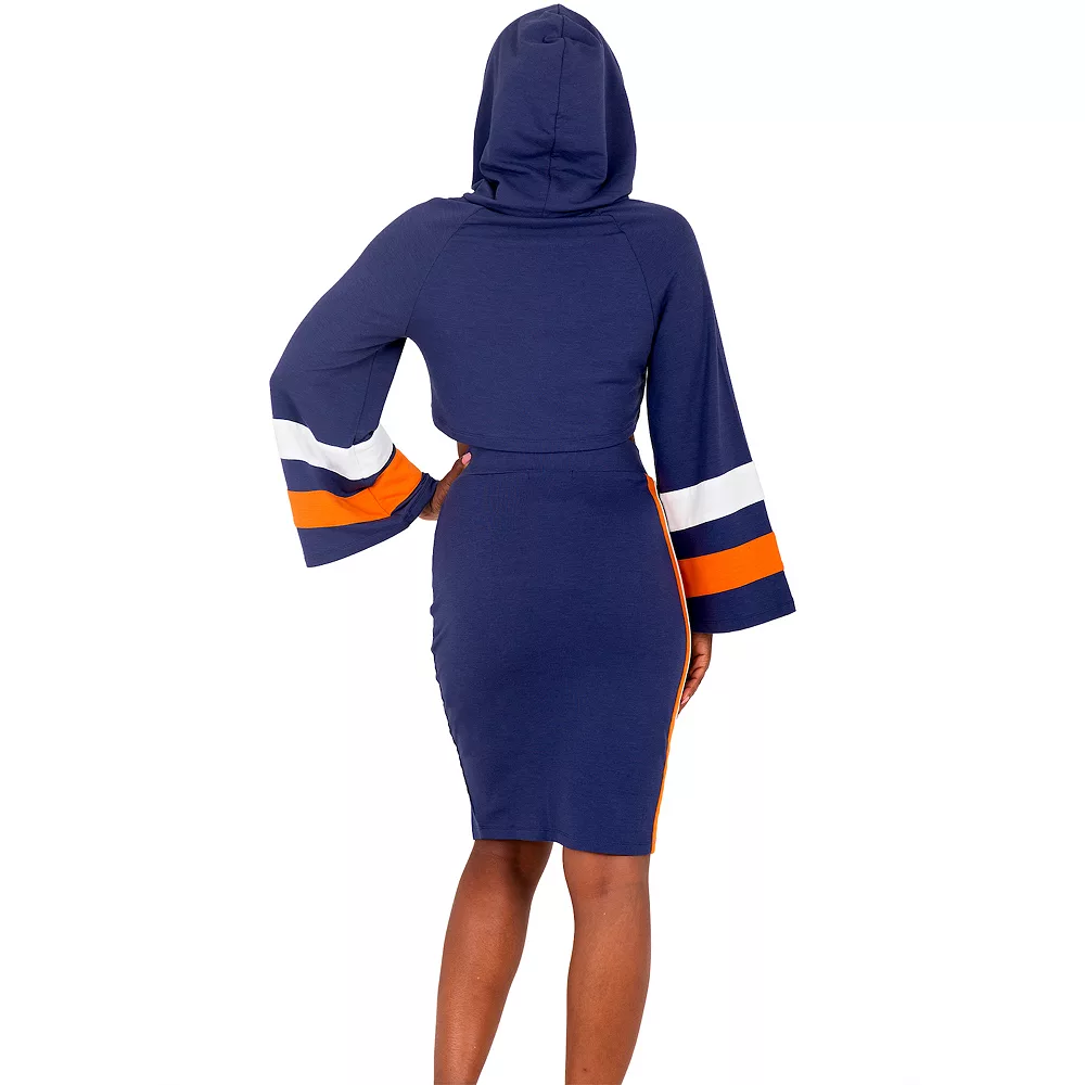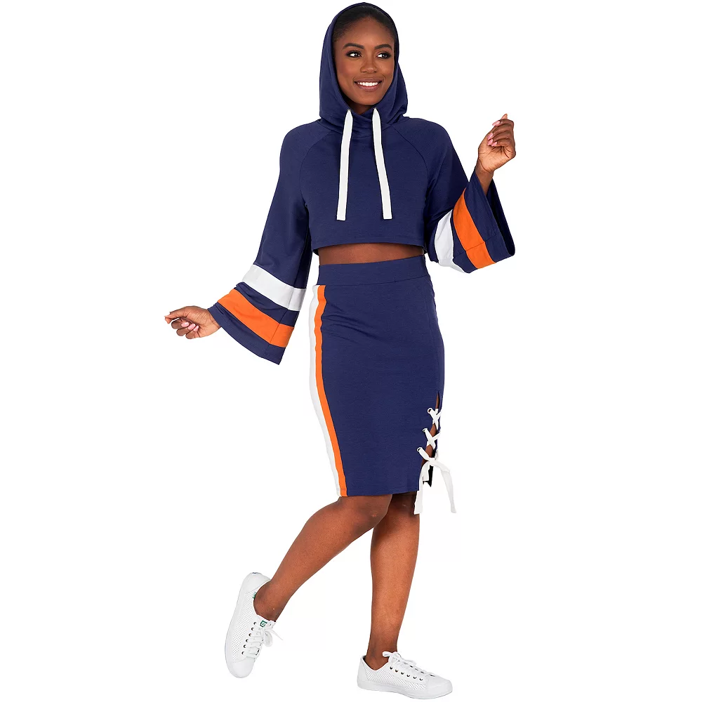 This 90s vibe navy cropped pull over features a wide white drawstring. The statement bell sleeves are finished with wide orange and white athletic stripes. This stylish, fashion-forward alternative to a traditional hoodie is a lightweight, casual option for relaxed days.
