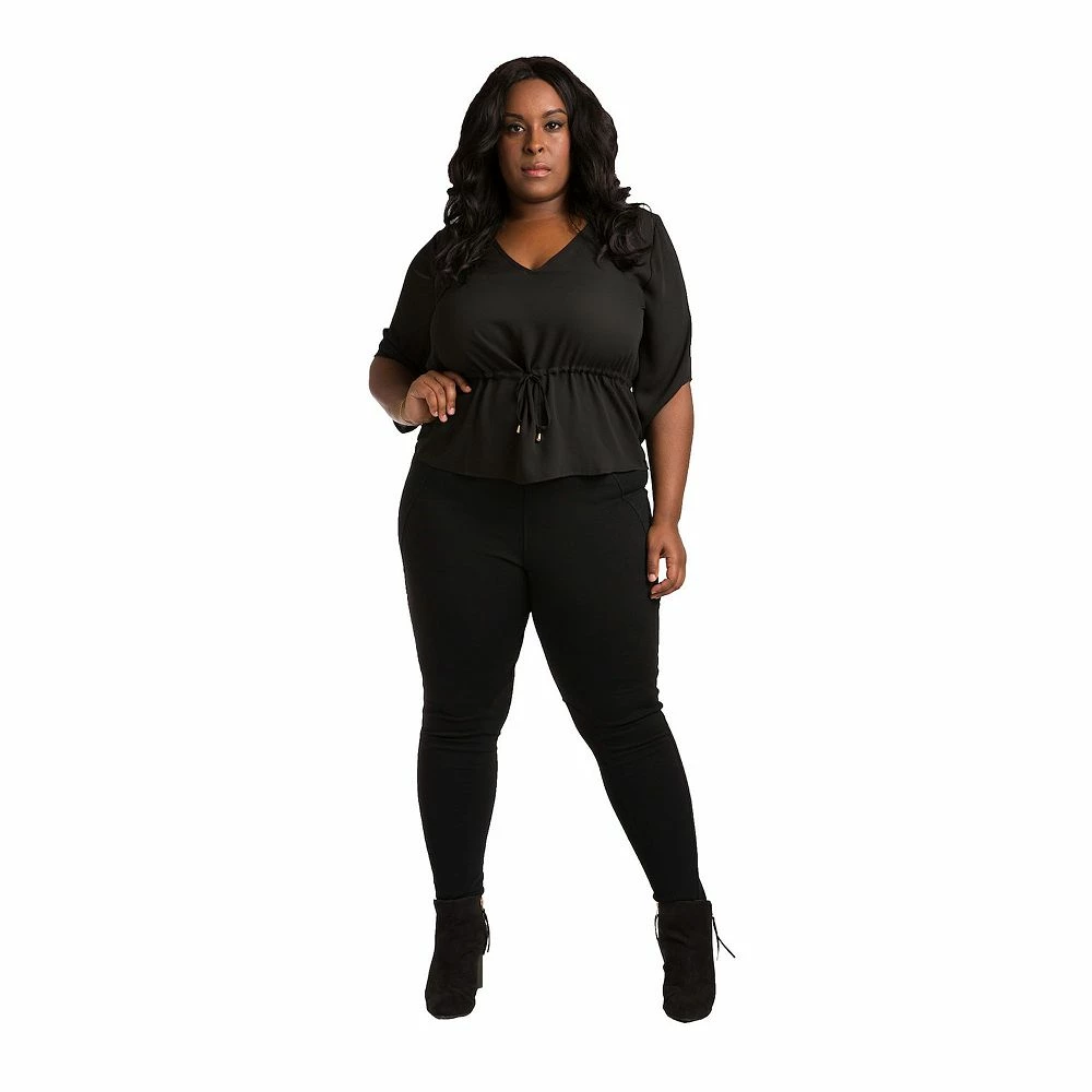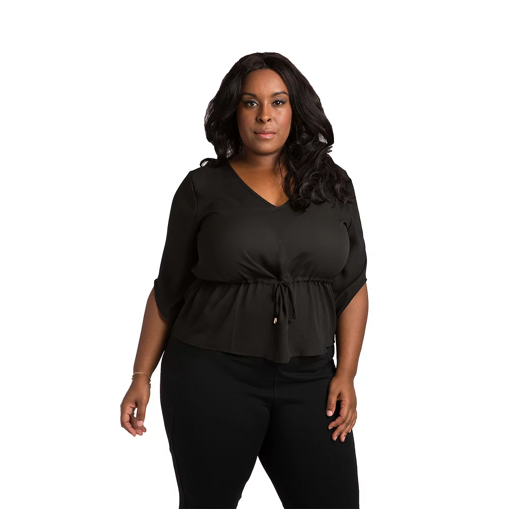 KEEP IT CLASSY AND CHIC. A relaxed fit that shows a little cleavage with a v-cut neckline. This blouse will accentuate your curves with an elastic drawstring at the waist.