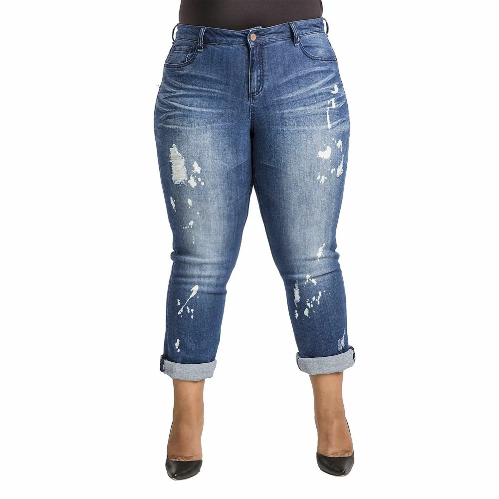 This is our new plus size boyfriend straight fit jeans with a relaxed waist, hip, and thigh. This is the perfect denim piece for that chic girl that loves a high end trendy look. We added a few details like a vintage wash, bleach spots, rolled hem, and distressed pockets to give this style a premium look.